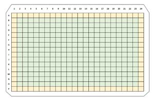 The siRNA was applied to the four different cell types using 384-well microplates. You can think of one microplate as 384 individual, very small test tubes called wells. A standard 384-well microplate is approximately 5 inches wide by 3.33 inches tall. There are 16 rows (labeled A through P) and 24 columns (numbered 1 through 24). A schematic of a 384-well microplate is shown in Figure 5. The outer rows and columns of a microplate are more sensitive to environmental factors such as temperature and humidity, and so the RxRx1 data was generated using only the interior 14 rows (B through O) and 22 columns (2 through 23) yielding 14 * 22 = 308 wells per microplate.