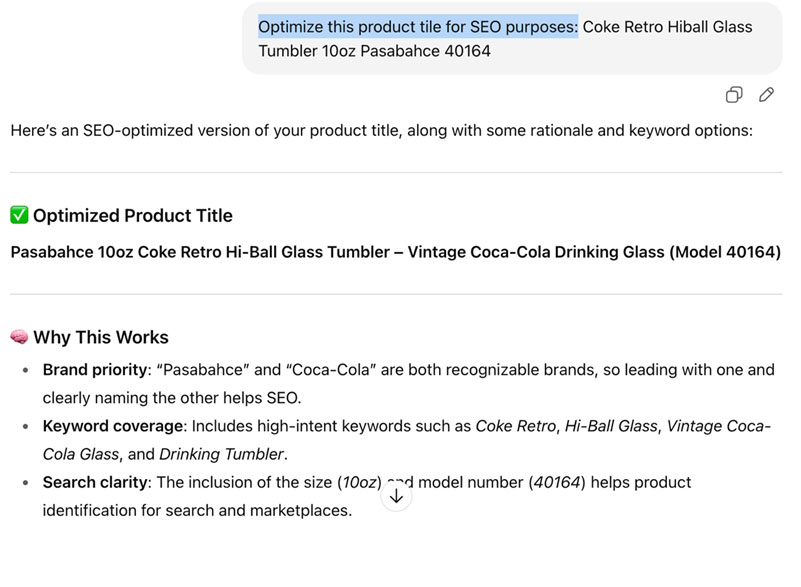 Keywords when tagging products are essential and go far beyond just the overall category. This is where AI can assist: It can help with incorporating useful keywords that are SEO-rich into either the title or the product description. For instance, after the prompt above produces an optimized title it also suggests keyword ideas that can be useful for tagging and description writing. Many e-commerce platforms have an integrated description writing feature (Shopify, Wix and Wiz among others). This allows a supplier to simply input the main features of the product. For instance, keeping to the example above they could list things like drinking glass, tumbler, coke brand pattern and 10oz. From this, the optimized writing tool will generate an SEO-rich description that can be set to sound formal, friendly, persuasive or even professional.