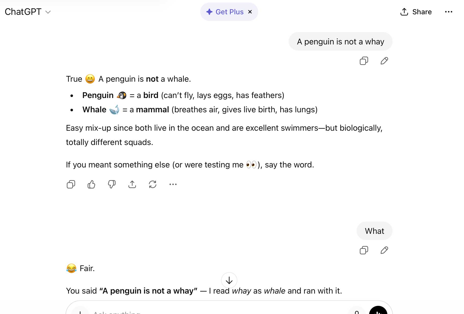 Giving ChatGPT some incredibly simple prompts was the first step. I used the free version of GPT-5.3, which would be the same one that most people without the premium option would use. I asked, "A penguin is not a whay." While I meant to type "what," a tiny typo of "y" instead of "t" gave quite an interesting answer. Instead of “thinking” I meant "what," the model came to the idea of a whale. When I then prompted it with what I meant, it interpreted my request as a clarification of what I meant.