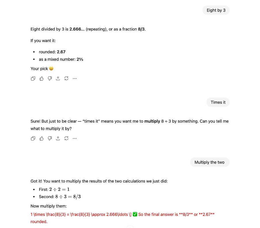Now I prompted it a bit more to ask it to "times it." Here's where it started getting slightly confused because the interpretation was that my prompt was asking for 8/3 to be multiplied by something else. I then said I would like for two to be multiplied (implying multiply 8 x 3). However, this slightly vague prompt was interpreted as multiplying the answer of 8/3 by the answer of 2/2 instead of what I originally meant. From here, I went simple and clear: "Multiply 8 and 3," to which the correct answer was then given.